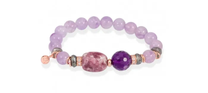 Pulsera de plata de primera ley (925) chapado en oro rosa 18kt con circonitas blancas, amatista y lepidolita. (medida de muñeca: 17,5 cm.)