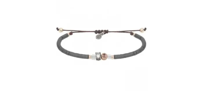Pulsera de plata de ley 925, cuentas de cristal, hematites grises, con un cabujón de turmalina rosa con baño de oro rosa de 24 kt acompañado de una circonita oval en tono light pink, y nylon ajustable.