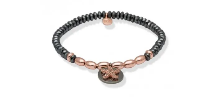Pulsera de plata de primera ley (925) con baño de rutenioy chapado en oro rosa de 18kt, hematites facetado y circonita coñac. Medida total de muñeca 16,5 cm.