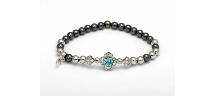 Pulsera de plata de primera ley (925) con baño de rodio y rutenio, circonita blanca y piedra sintetica color aguamarina. Medida de muñeca 17 cm.