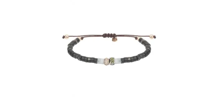Pulsera de plata de ley 925 de la colección Menorca, que combina la elegancia del jaspe negro con la delicadeza del jade, con detalles centrales hechos de plata envejecida acabada a mano: una circonita talla oval de 5x3mm en color verde peridoto y una pieza de pavé de circonitas en tonos miel que aportan sutileza y equilibrio al conjunto.