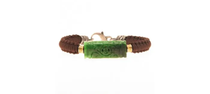 Pulsera en cuero y nylon náutico marrón (muy resistente). Cierre en plata envejecida de primera ley (925), piedra central New Jade con una pieza de oro de 18 Quilates a cada lado.