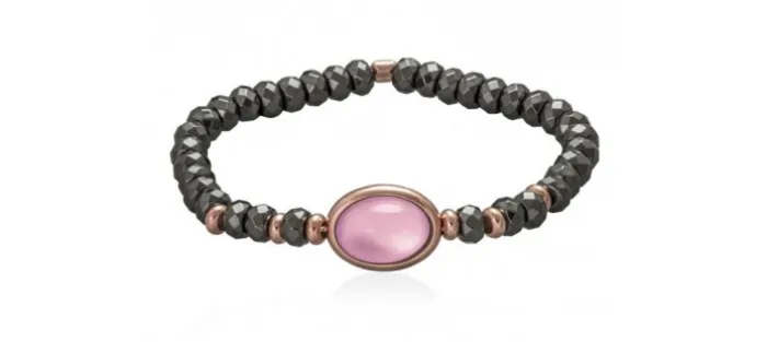 Pulsera de plata de primera ley (925) chapada en oro rosa de 18kt con hematites y doblete de cuarzo milky y nácar rosa.