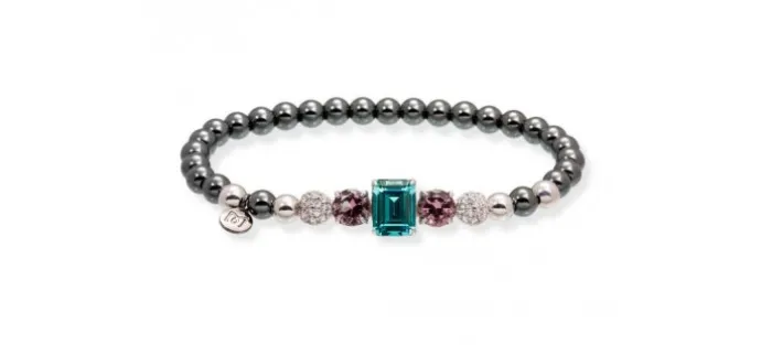 Pulsera de plata de primera ley (925) con baño de rodio y rutenio, circonita blanca, zafiro fucsia sintético y piedra sintetica color paraiba. Medida total de muñeca 17 cm.