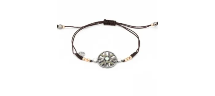 Pulsera plata envecida de primera ley (925) entre peizas de oro rosa, cordon de macrame lleva doblete coral calcedonia y circonitas.