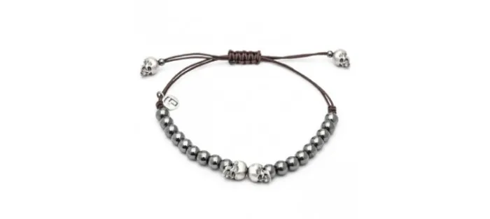 Pulsera macrame calavera de plata. Engastado con piedras semipreciosas. Entrepieza central calavera plata y bolas de hematite. Terminales calavera plata.