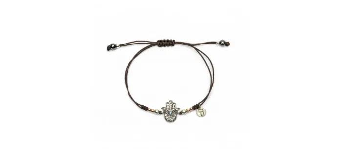 Pulsera de macramé con bolas de plata y plata bañada en oro rosa de 3mm con una mano de Fátima repleta de piedras semipreciosas y circonitas.