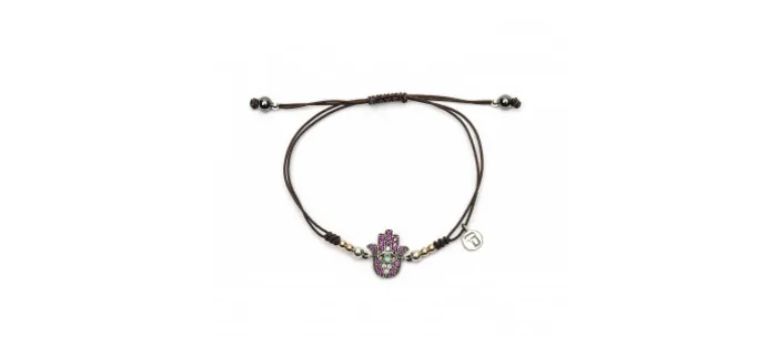 Pulsera de macramé con bolas de plata y plata bañada en oro rosa de 3mm con una mano de Fátima repleta de piedras semipreciosas y circonitas.