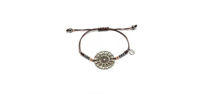Pulsera de macramé con bolas de plata de 3mm bañadas en oro rosa y hematites con una piedra semipreciosa con orla de circonitas en el centro y dos orlas de circonitas navette y pera
