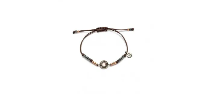 Pulsera de macramé con hematites y bolas de plata de 3mm bañadas en oro rosa con una piedra semipreciosa central de 4mm con orla de circonitas.