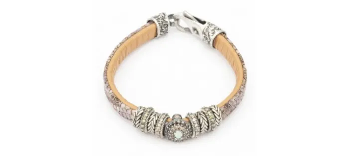 Pulsera de cuero y plata. Engastado con piedras semipreciosas. Pieza central de 14x12mm de calcedonia verde y orla circonitas brown, cava. Entrepiezas plata, circonita cava y verde. Cuero 7mm. Cierre mosquetón de plata. Diseño elaborado en España 100% artesanal.