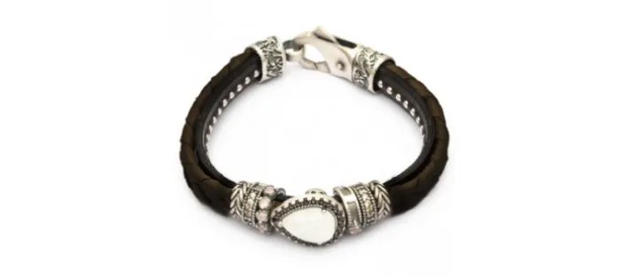 Pulsera de cuero y plata. Engastado con piedras semipreciosas. Piedra central piedra luna 8x12mm, ojo de gato rosa cuadrado y orla circonitas brown, cava. Entrepiezas plata y cuero 7mm. Cierre mosquetón.