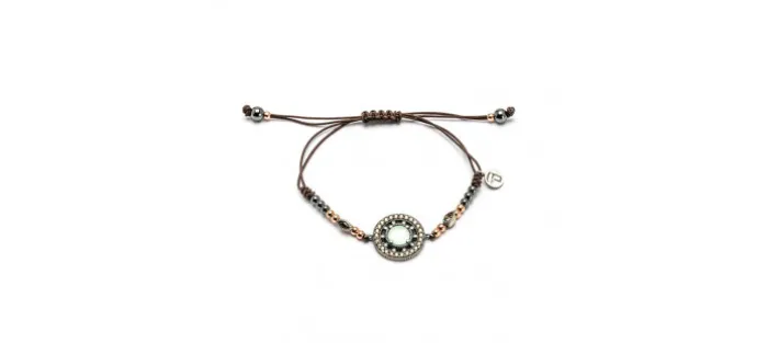 Pulsera de macramé con hematites y bolas de plata de 3mm bañadas en oro rosa con una piedra semipreciosa central de 7mm con orla de circonitas y dos circonitas navette.