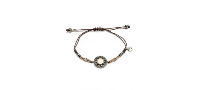 Pulsera de macramé con hematites y bolas de plata de 3mm bañadas en oro rosa con una piedra semipreciosa central de 7mm con orla de circonitas y dos circonitas navette.