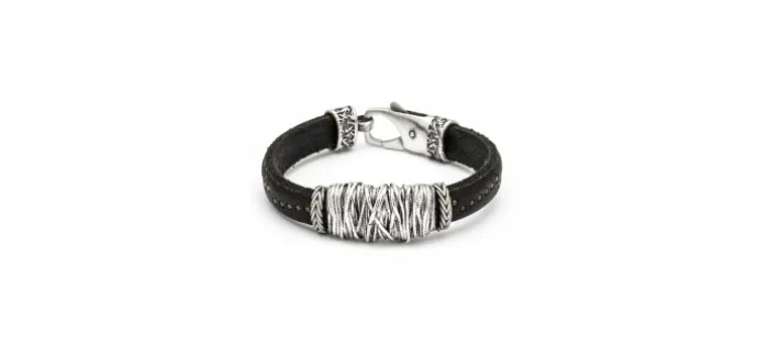 Pulsera de cuero marrón oscuro ancho de 10mm repleto de detalles con un tirabuzón de plata.