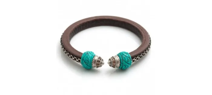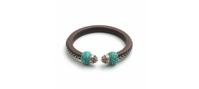 Pulsera de plata envejecida (925), cuero, Circonitas y Turquesa.