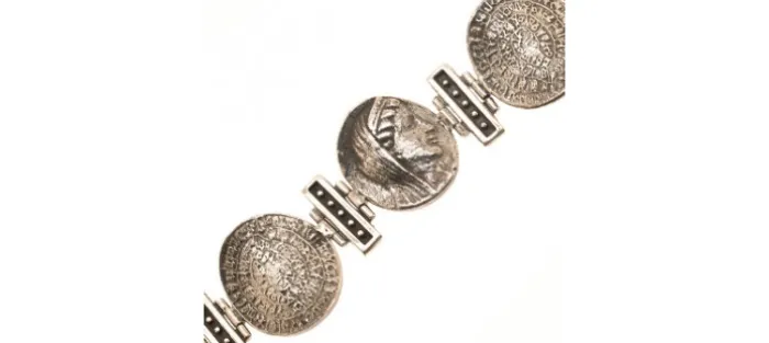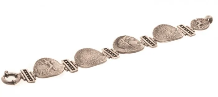 Pulsera compuesta por varias reproducciones de diversas monedas en plata envejecida de primera ley (925). La pulsera de la imagen mide 17 cm, y podemos fabricarla en cualquier otra medida ya que usamos monedas de distintos diámetros.