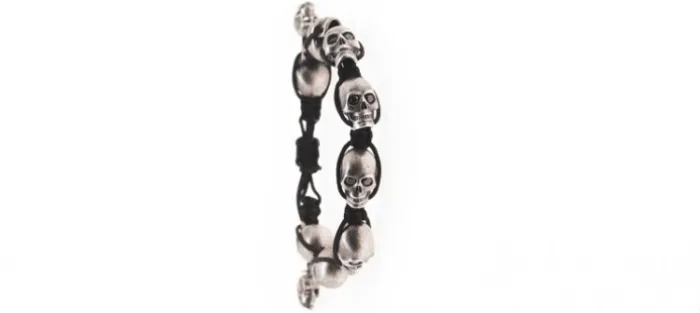 Pulsera de calaveras en plata envejecida de primera ley (925) y nylon náutico (muy resistente). 2 espinelas sintéticas en los ojos de cada calavera. Color: NEGRO. Cierre mediante nudo corredizo ajustable de medida.