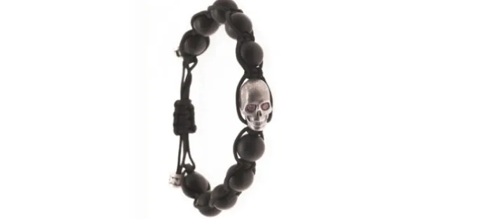 Pulsera de calavera en plata envejecida de primera ley (925),bolas de onix mate y nylon náutico (muy resistente) 2 rubíes sinteticos en los ojos. Color: NEGRO. Cierre mediante nudo corredizo ajustable de medida.