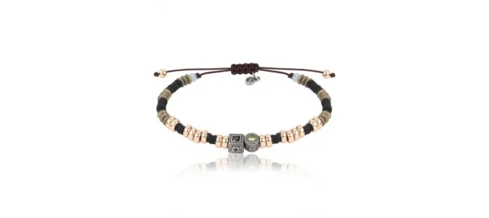 Pulseras Arán combinando discos de caucho, discos de plata bañada en oro rosa, hematites y ágatas. En el centro lucen dos motivos de plata de ley 925 envejecida con un precioso grabado y circonitas brown y peridoto. Todo montado en hilo de nailon marrón de medida ajustable.