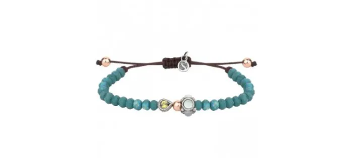 Pulsera con dos pieza de plata y una bola baño de oro rosa de 18kt. Pieza de plata con 4 cabujones lisos de calcedonia, circonita de color peridoto y cuentas de cristal facetadas de color azul celeste. Está montada en hilo de nailon color chocolate, con 3 bolas de plata con baño de oro rosa de 18 kt de 4 mm de diámetro.