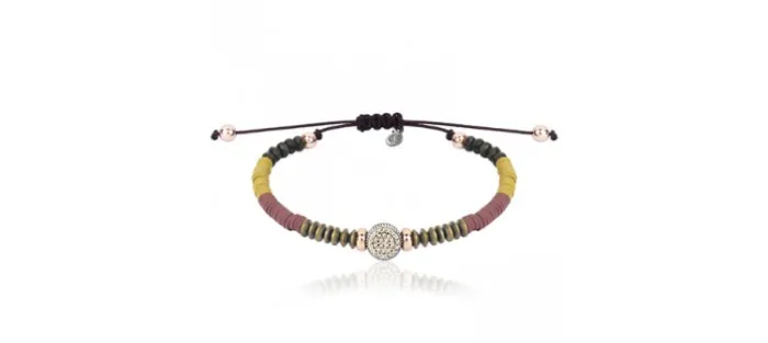 Pulsera de plata envejecida con circonitas champangne talla brillante, hematites, cuentas de cristal y discos de caucho. Montada en hilo de nailon marrón. Ideal para combinar con otras pulseras Sunfield.
