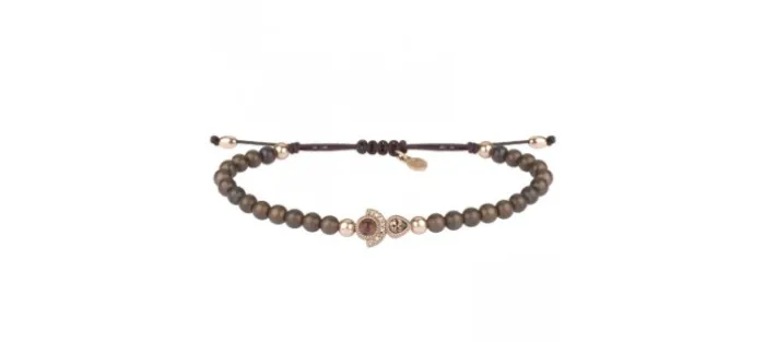 Pulsera SUNFIELD con pieza central de 0,9 cm por 1,3 cm, de plata con baño de oro rosa de 18 kt, turmalina rosa, circonitas y hematites. Está montada en hilo de nailon de color negro de 1 mm y 6 bolas de 4 mm de diámetro de plata con baño de oro rosa de 18 kt.