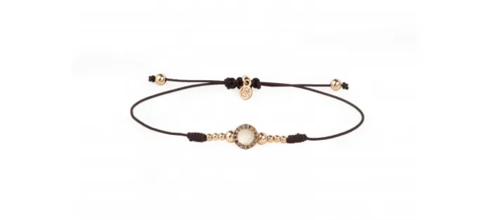 Pulsera de Plata de primera ley (925) bañada en oro rosa con un Cuarzo rosa central y Zirconitas marrones. Cierre con nudo corredizo.