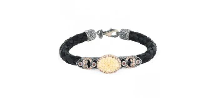 Pulsera de cuero negro (con mosquetón) y plata envejecida de primera ley (925) con hueso y Zirconitas marrones.