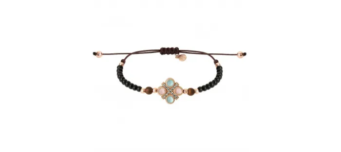 Pulsera de plata de ley 925 con baño de oro rosa, símil ópalo azul, símil ópalo rosa, circonitas, ágatas, hematites y nylon.