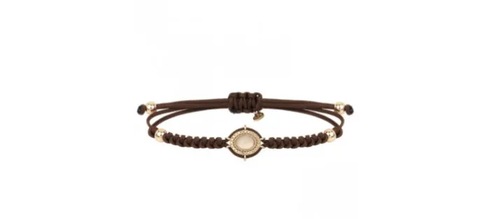 Pulsera SUNFIELD con pieza central de 1,4 cm por 1,7 cm, de plata con baño de oro rosa de 18 kt, cuarzo rosa y circonitas. Está montada en hilo de nailon de color chocolate de 1 mm y 4 bolas de 4 mm de diámetro de plata con baño de oro rosa de