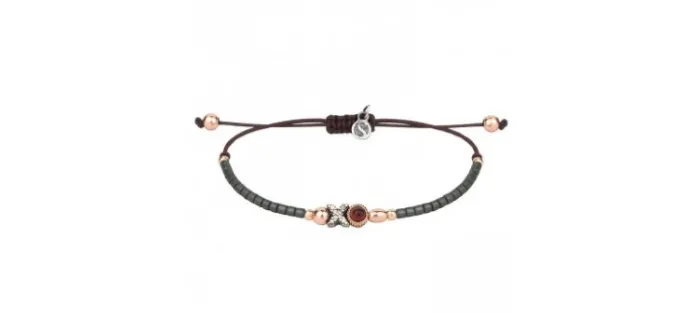 Pulsera con pieza de plata envejecida junto a piezas laterales de plata con baño de oro rosa de 18 kt, con tubo de hematite de 2 mm por 2 mm, circonita de color champagne y un cabujón liso de granate de 3 mm de diámetro. Está montada en hilo de nailon color chocolate, con 4 bolas de 2,5 mm, 3 bolas de 4 mm y 1 abalorio abombado de 4,5 mm por 3 mm de plata con baño de oro rosa de 18 kt.