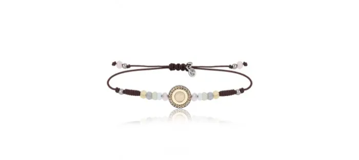 Pulsera que en su centro luce un motivo circular fabricado en plata de ley 925 acabado envejecido de 11,5 mm de diámetro con un cabujón facetado de cuarzo rosa rodeado de un bisel de oro amarillo de 9 k y circonitas champagne talla brillante. En el resto de la pulsera se combinan cuentas de cristal en tonos pastel con bolas de plata. Está montada sobre hilo de nailon marrón de medida ajustable.
