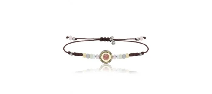 Pulsera que en su centro luce un motivo circular fabricado en plata de ley 925 acabado envejecido de 11,5 mm de diámetro con un cabujón facetado de turmalina rosa rodeado de un bisel de oro amarillo de 9 k y circonitas peridoto talla brillante. En el resto de la pulsera se combinan cuentas de cristal en tonos pastel con bolas de plata. Está montada sobre hilo de nailon marrón de medida ajustable.