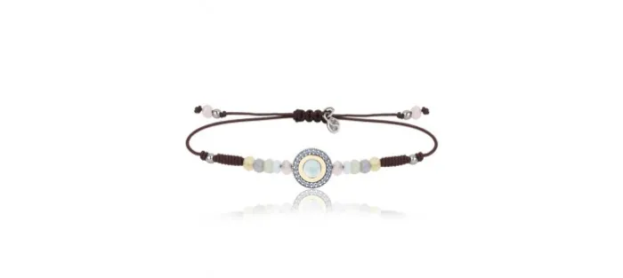 Pulsera que en su centro luce un motivo circular fabricado en plata de ley 925 acabado envejecido de 11,5 mm de diámetro con un cabujón facetado de símil aguamarina rodeado de un bisel de oro amarillo de 9 k y circonitas aguamarina talla brillante. En el resto de la pulsera se combinan cuentas de cristal en tonos pastel con bolas de plata. Está montada sobre hilo de nailon marrón de medida ajustable.