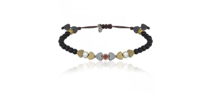 Pulsera de plata envejecida y bañada en oro rosa con un cabujón liso de turmalina rosa de 3 mm y dos de calcedonia de 3 mm y hematites con forma redonda y forma de corazón. Montada en nailon marrón con cierre ajustable.