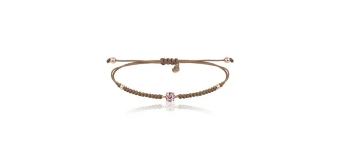 Pulsera con un motivo central fabricado en plata de ley 925 bañado en oro rosa con una circonita color fucsia talla brillante de 5 mm de diámetro. Está montada con un resistente hilo de nailon nude de medida ajustable.