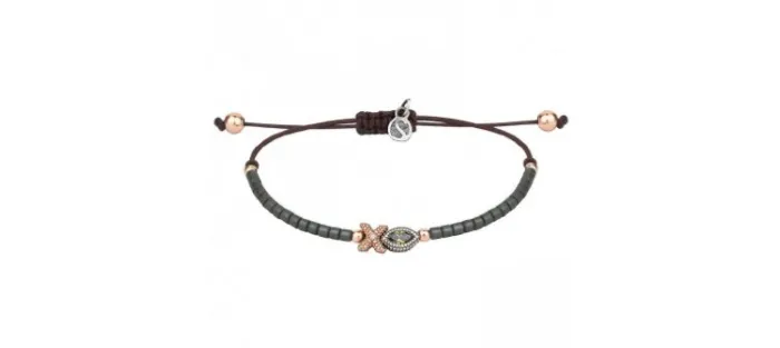 Pulsera con pieza central de plata con baño de oro rosa de 18 kt, pieza lateral de plata envejecida, con tubo de hematite gris oscuro de 2 mm por 2 mm y circonita de color brown y peridoto. Está montada en hilo de nailon color chocolate, con 4 bolas de 2,5 mm y 2 bolas de 4 mm de plata con baño de oro rosa de 18 kt.