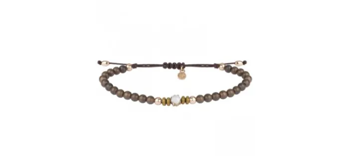 Pulsera SUNFIELD con pieza central de 0,6 cm de diámetro, de plata con baño de oro rosa de 18 kt, de calcedonia, con circonitas y hematites. Está montada en hilo de nailon de color verde de 1 mm y 4 bolas de 4 mm de diámetro de plata con baño de oro rosa de 18 kt.