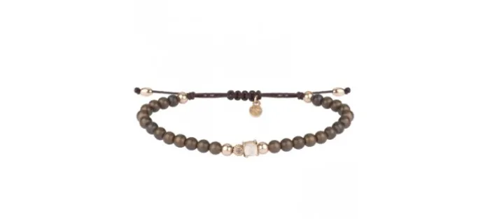 Pulsera SUNFIELD con pieza central de 1 cm por 0,9 cm, de plata con baño de oro rosa de 18 kt, cuarzo rosa, circonitas y hematites. Está montada en hilo de nailon de color negro de 1 mm y 6 bolas de 4 mm de diámetro de plata con baño de oro rosa de 18 kt.