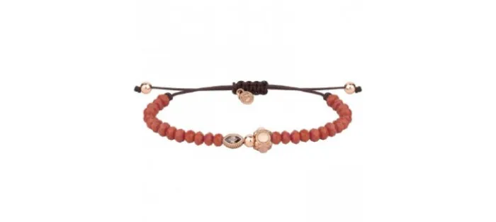 Pulsera con dos pieza de plata con baño de oro rosa de 18 kt. Pieza lateral de plata con baño de oro rosa de 18 kt y 4 cabujones lisos de cuarzo rosa y cuentas de cristal facetadas de color coral. Está montada en hilo de nailon color chocolate, con 3 bolas de plata con baño de oro rosa de 18 kt de 4 mm de diámetro.