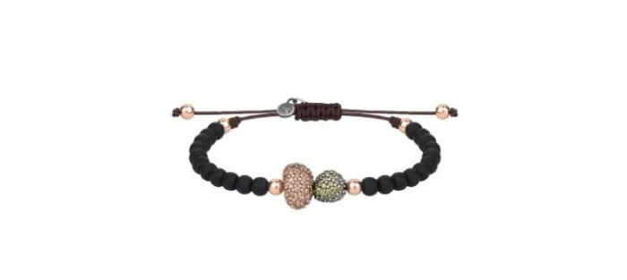 Pulsera de piezas de plata con baño de oro rosa de 18 kt, circonitas de color brown y peridoto y bolas de ónix de 4,5 mm de diámetro. Está montada en hilo de nailon de color chocolate, con 6 bolas de 4 mm de diámetro de plata con baño de oro rosa de 18 kt.