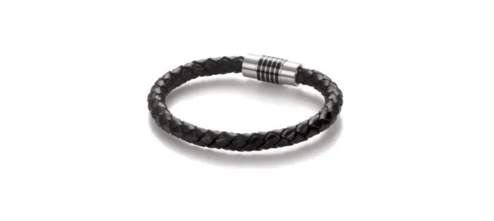 Pulsera Teno de Cuero trenzado y pieza de Acero Inoxidable con cerámica negra incrustada.
