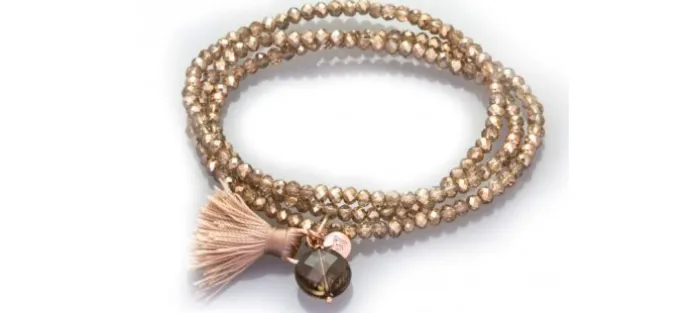 Pulsera de plata de primera ley (925) chapada en oro rosa de 18kt con cristal de Strass facetado color dorado y cuarzo fumé. (largo: 51 cm.)