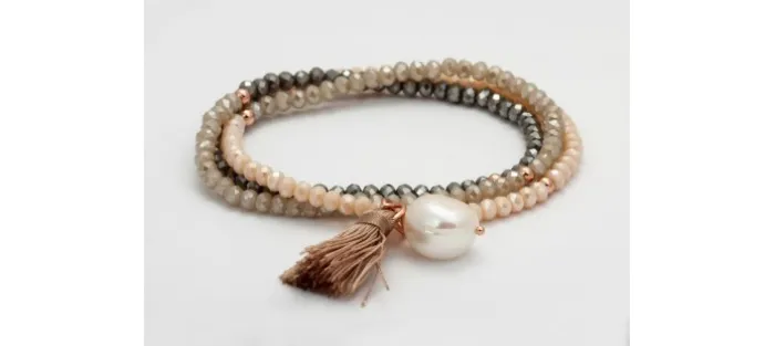 Pulsera de plata de primera ley (925) chapada en oro rosa de 18K, cristal de Strass facetado color triple marron y una perla cultivada. (largura: 51cm)