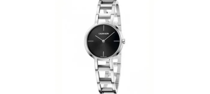 Caja y armis de acero 316L hipoalergénico (caja de 32 mm de diámetro). Esfera negra con dos agujas. Corona con el logotipo de la marca cK. Resistente al agua 30 metros.