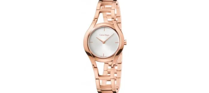 Caja y armis de acero 316L hipoalergénico con tratamiento PVD rosa brillo (caja de 32 mm de diámetro). Esfera blanca con dos agujas. Corona con el logotipo de la marca cK. Resistente al agua 30 metros.