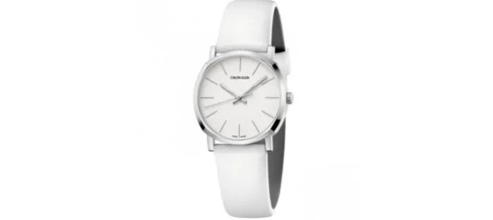 Caja de acero 316L hipoalergénico (caja de 33 mm de diámetro) y ulsera de piel blanca. Esfera blanca con dos agujas. Corona con el logotipo de la marca cK. Resistente al agua 30 metros.