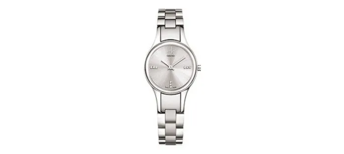 Caja y armis de acero 316L hipoalergénico (caja de 28 mm de diámetro). Esfera blanca con dos agujas y 9 diamantes auténticos . Corona con el logotipo de la marca cK. Resistente al agua 30 metrros. Cristal de zafiro.