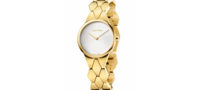 Caja y armis de acero 316L hipoalergénico con tratamiento PVD amarillo brillo (caja de 28mm de diámetro). Esfera blanca con dos agujas. Corona con el logotipo de la marca cK. Resistente al agua 30 metros.